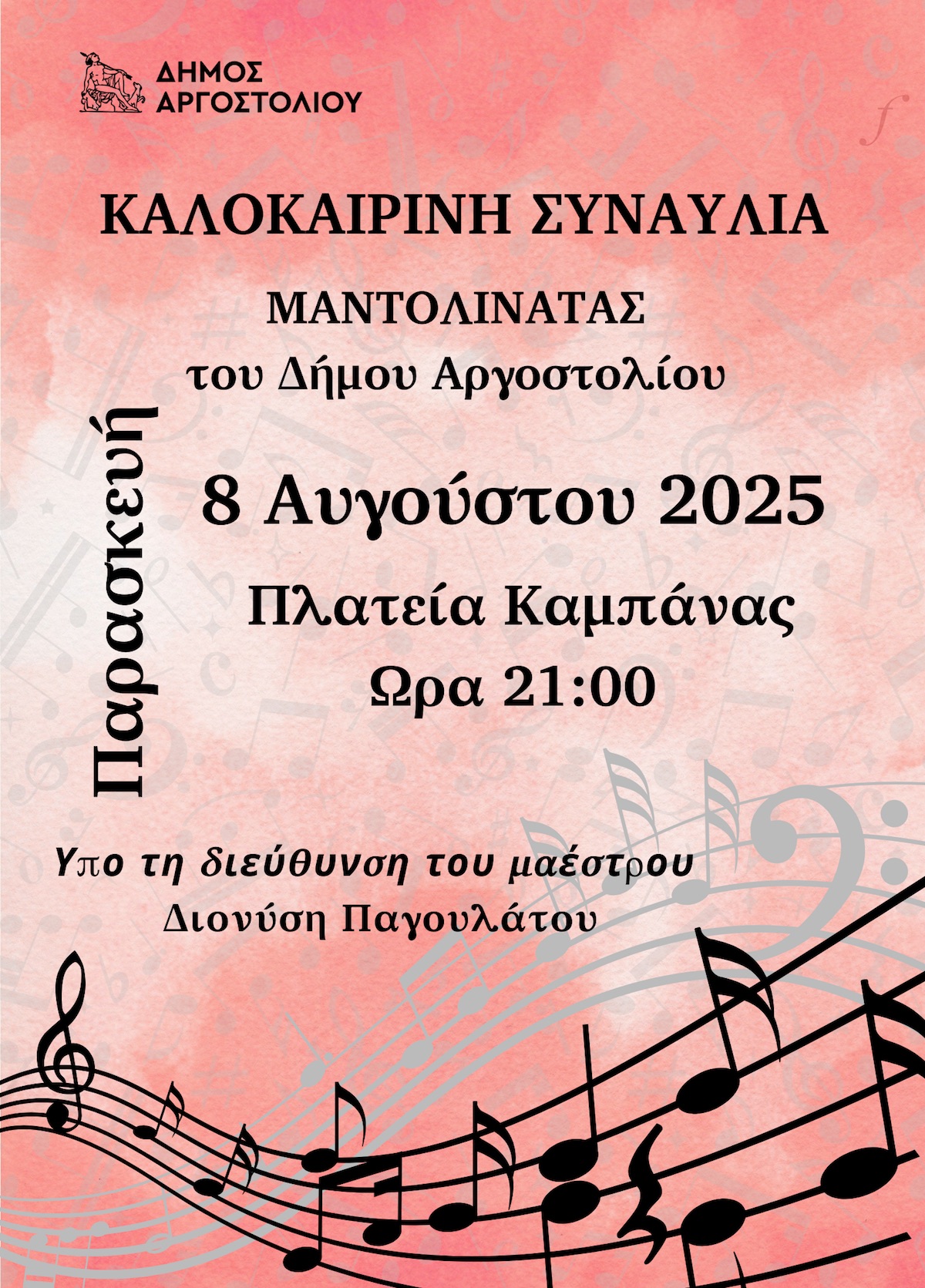 Στo πλαίσιo των εκδηλώσεων Πολιτιστικό Καλοκαίρι 2025 του Δήμου Αργοστολίου, το τμήμα της Δημοτικής Μαντολινάτας θα πραγματοποιήσει Συναυλία την Παρασκευή 8 Αυγούστου 2025 και ώρα 21:00 στην πλατεία Καμπάνας στο Αργοστόλι.