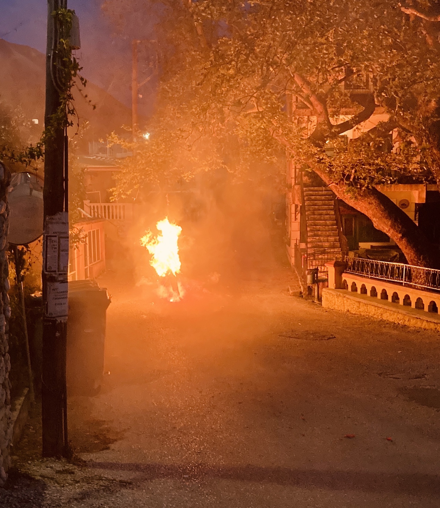Παρά τον δυνατό άνεμο, η παρέα των παιδιών του χωριού έκαψαν τον Ιούδα κάτω από τον εμβληματικό πλάτανο στο κέντρο του χωριού, συνοδεία κροτίδων και βαρελότων, παρουσία κυρίως νέων παιδιών. Κλιμάκιο των Εθελοντών Πυροσβεστών 21ας ήταν σε επιφυλακή με το ειδικό όχημά τους για παν ενδεχόμενο λόγω του ανέμου.