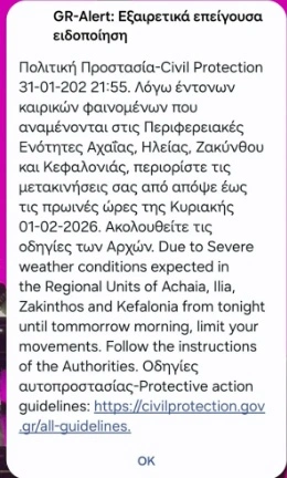 Λόγω των έντονων καιρικών φαινομένων που αναμένονται στις περιφερειακές ενότητες Αχαϊας, Ηλείας, Ζακύνθου και Κεφαλονιάς, περιορίστε τις μετακινήσεις σας από απόψε έως τις πρωινές ώρες της Κυριακής (1/2). Ακολουθείτε τις οδηγίες των Αρχών», ανέφερε το μήνυμα από το 112
