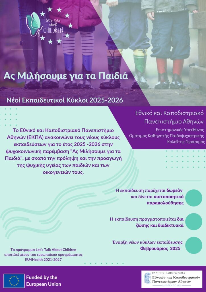Το Πρόγραμμα αποτελεί μέρος του Ευρωπαϊκού Προγράμματος EU4Health 2021-27, με κοινοπραξία 8 χωρών, με σκοπό τη διάδοση και εφαρμογή της ψυχοκοινωνικής παρέμβασης “Ας Μιλήσουμε για τα Παιδιά” σε εκπαιδευτικούς της Α’βάθμιας Εκπαίδευσης. Επιστημονικός Υπεύθυνος και Συντονιστής του Προγράμματος στην Ελλάδα είναι ο Γεράσιμος Α. Κολαΐτης, Ομ. Καθηγητής Παιδοψυχιατρικής της Ιατρικής Σχολής του ΕΚΠΑ.