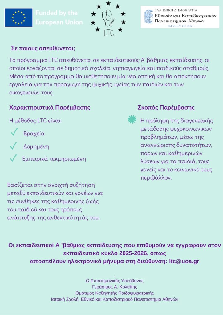 Το Εθνικό και Καποδιστριακό Πανεπιστήμιο Αθηνών (ΕΚΠΑ), σε συνεργασία με το Ελληνικό Ινστιτούτο Μελέτης Τραύματος και Προαγωγής Ψυχικής Υγείας, πραγματοποιεί εκπαιδευτικό Πρόγραμμα με τίτλο «Ας Μιλήσουμε για τα Παιδιά» (Let’s Talk About Children, LTC), με σκοπό την πρόληψη και προαγωγή της ψυχικής υγείας των παιδιών και των οικογενειών τους.
