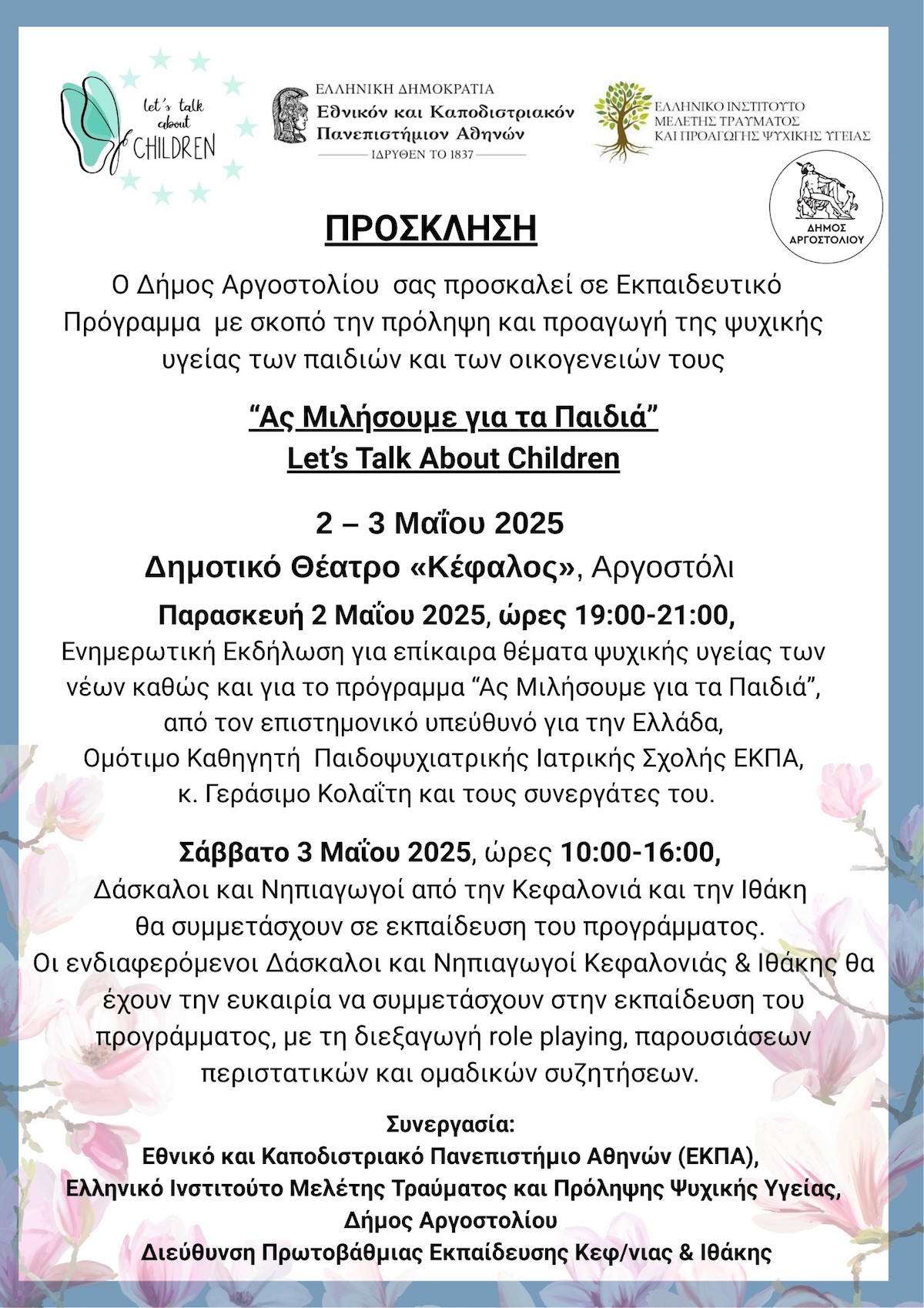 Επ’ ευκαιρία της εκπαίδευσης εκπαιδευτικών Α’βάθμιας Εκπαίδευσης Kεφαλονιάς-Ιθάκης, στο πλαίσιο του Ευρωπαικού Προγράμματος “Ας Μιλήσουμε για τα Παιδιά”, το Εθνικό και Καποδιστριακό Πανεπιστήμιο Αθηνών (ΕΚΠΑ) και το Ελληνικό Ινστιτούτο Μελέτης Τραύματος και Πρόληψης Ψυχικής Υγείας σε συνεργασία με τον Δήμο Αργοστολίου και την Διεύθυνση Α’βάθμιας Εκπαίδευσης, διοργανώνουν την Παρασκευή, 2 Μαΐου 2025, και ώρες 19:00-21:00, στο Θέατρο “Κέφαλος” Αργοστολίου, ενημερωτική εκδήλωση για επίκαιρα θέματα ψυχικής υγείας των νέων, καθώς και για το Πρόγραμμα “Ας Μιλήσουμε για τα Παιδιά”, από τον επιστημονικό υπεύθυνό του για την Ελλάδα, Ομότιμο Καθηγητή Παιδοψυχιατρικής Γεράσιμο Κολαΐτη και τους συνεργάτες του.