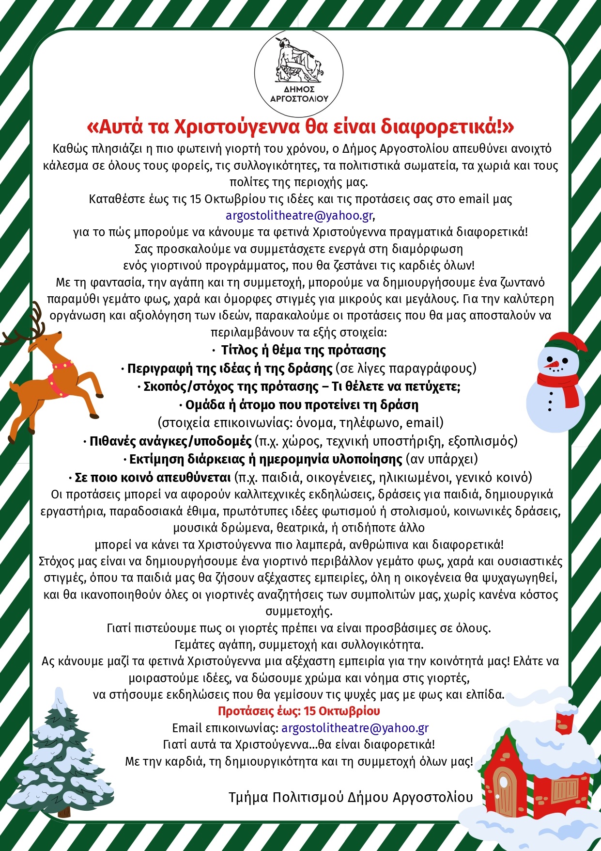 Οι προτάσεις μπορεί να αφορούν καλλιτεχνικές εκδηλώσεις, δράσεις για παιδιά, δημιουργικάεργαστήρια, παραδοσιακά έθιμα, πρωτότυπες ιδέες φωτισμού ή στολισμού, κοινωνικές δράσεις,μουσικά δρώμενα, θεατρικά, ή οτιδήποτε άλλομπορεί να κάνει τα Χριστούγεννα πιο λαμπερά, ανθρώπινα και διαφορετικά!