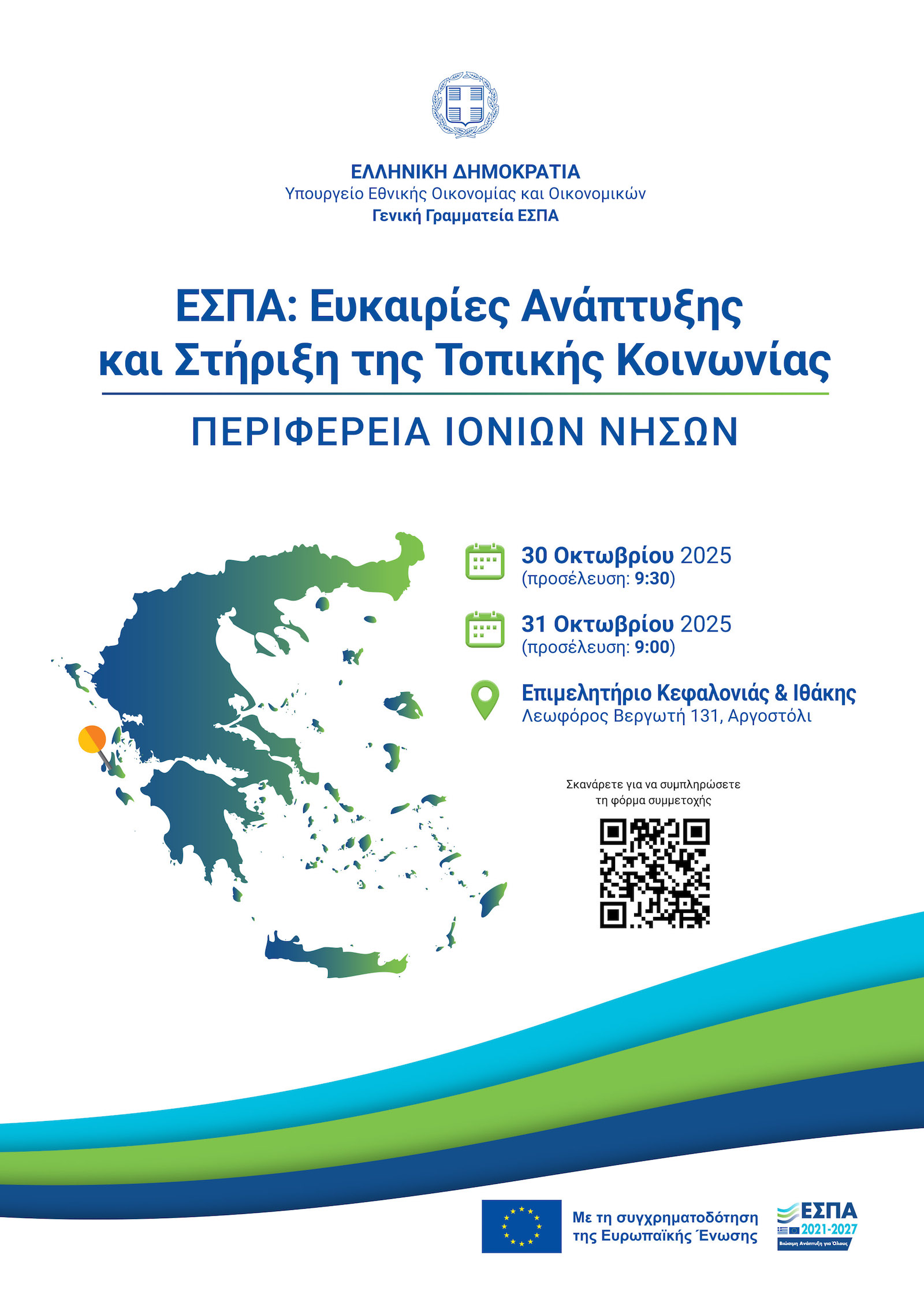 Η Γενική Γραμματεία ΕΣΠΑ του Υπουργείου Εθνικής Οικονομίας και Οικονομικών διοργανώνει στην Περιφέρεια Ιονίων Νήσων Διημερίδα με θέμα «ΕΣΠΑ: Ευκαιρίες Ανάπτυξης και Στήριξη της Τοπικής Κοινωνίας», η οποία θα πραγματοποιηθεί στις 30 και 31 Οκτωβρίου 2025 στο Επιμελητήριο Κεφαλονιάς & Ιθάκης στο Αργοστόλι Κεφαλονιάς.