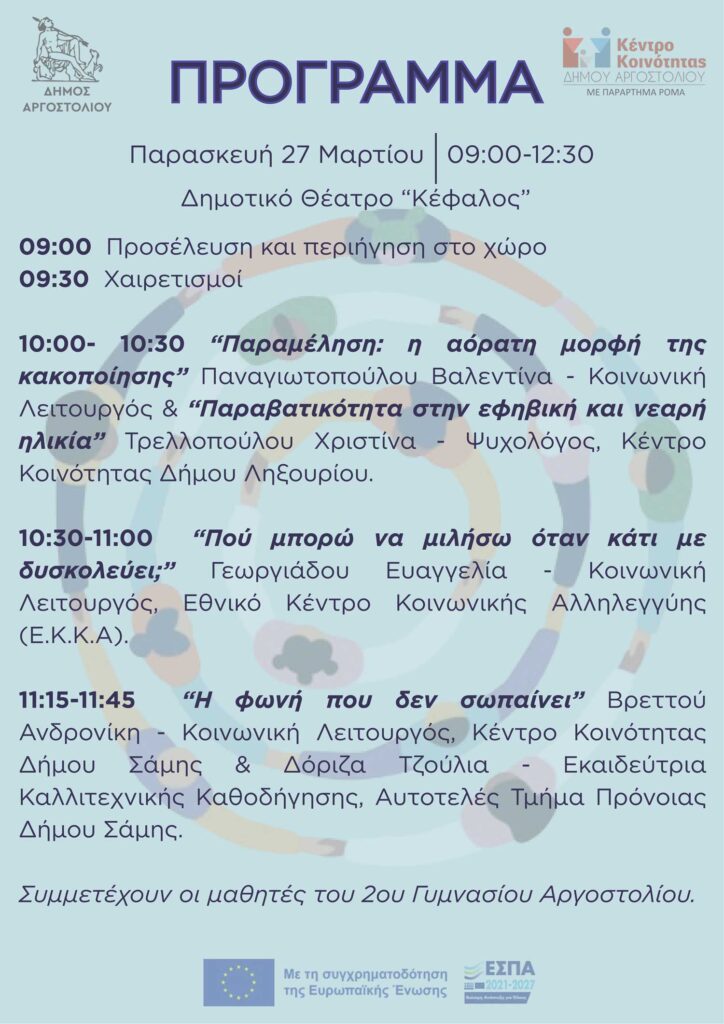 Η δράση θα πραγματοποιηθεί την Παρασκευή 27 Μαρτίου, στο Δημοτικό Θέατρο «Ο Κέφαλος» στο Αργοστόλι, και απευθύνεται σε μαθητές και μαθήτριες της Γ΄ τάξης των Γυμνασίων του Δήμου.