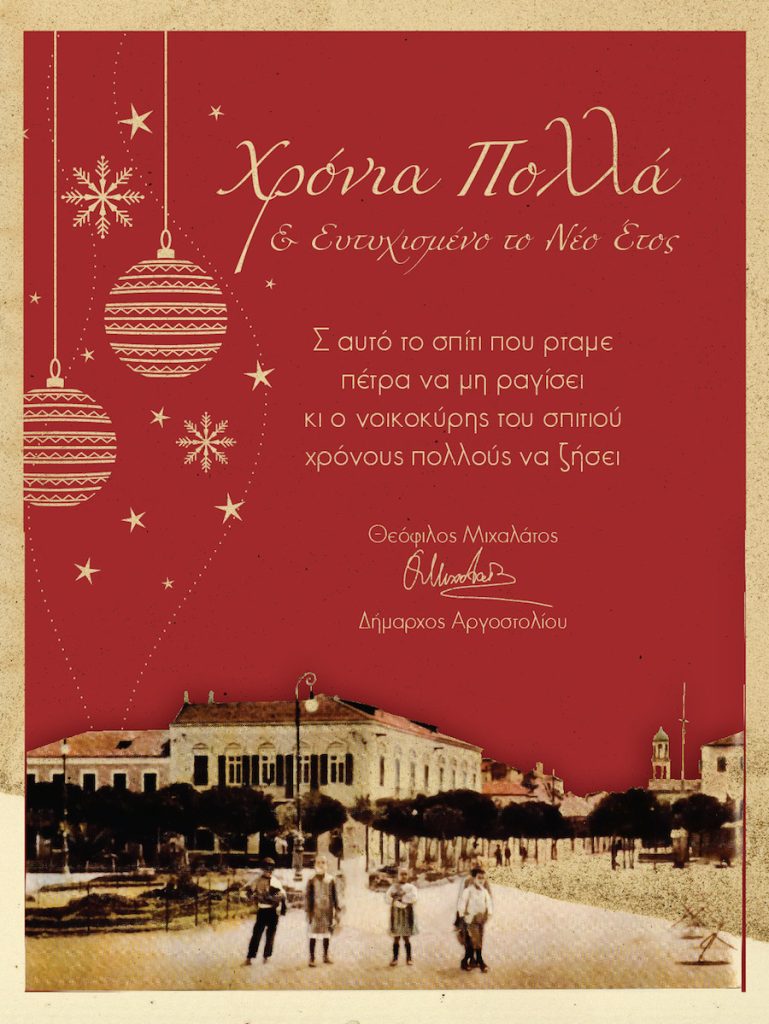Χρόνια Πολλά και ευτυχισμένο το Νέο έτος μας εύχεται ο Δήμαρχος Αργοστολίου Θ. Μιχαλάτος με στίχο από τα Χριστουγεννιάτικα κάλαντα “Σ΄ αυτό το σπίτι που ρταμε πέτρα να μη ραγίσει και ο νοικοκύρης του σπιτιού χρόνους πολλούς να ζήσει…”