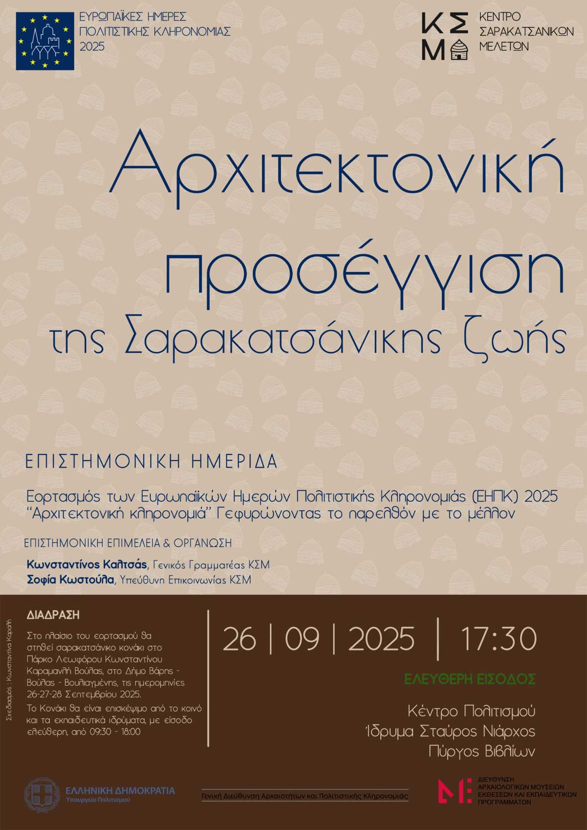 Το Κέντρο Σαρακατσάνικων Μελετών ανακοινώνει τη διοργάνωση επιστημονικής ημερίδας στο Κέντρο Πολιτισμού Ίδρυμα Σταύρος Νιάρχος, στις 26 Σεπτεμβρίου 2025 και ώρα 17:30, στην αίθουσα Πύργος Βιβλίου, με θέμα:
