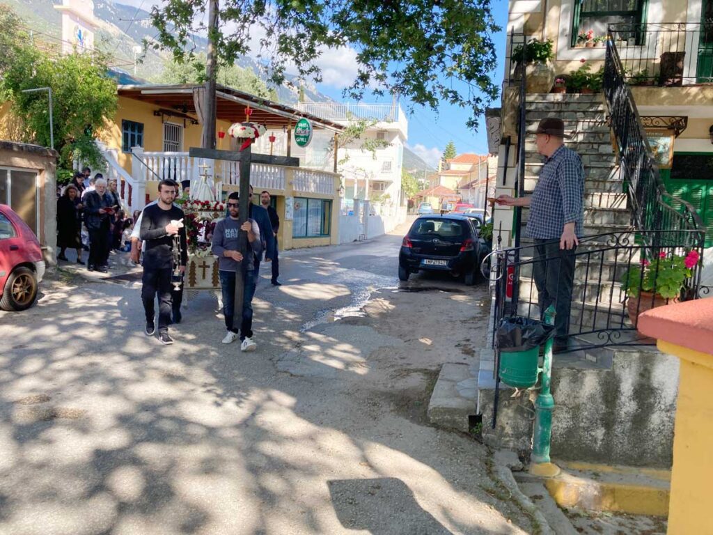 Η Περιφορά του Επιταφίου έγινε στον κεντρικό δρόμο του χωριού με απαραίτητη στάση στον Πλάτανο όπου στη βάση του ρέει ασταμάτητα το νερό της πηγής που πηγάζει από τον Αίνο και τις προηγούμενες δεκαετίες ξεδιψούσε ανθρώπους και φυτά.