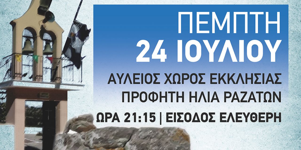 Την ΠΕΜΠΤΗ 24 Ιουλίου 2025 και ώρα 21:15, στον πευκόφυτο αύλειο χώρο του Προφήτη Ηλία στα Ραζάτα (προς Κυκλώπεια Τείχη Αρχαίας Κράνης).