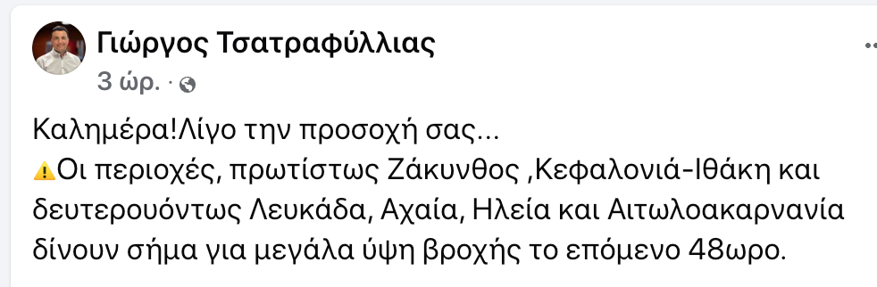 Με τον μετεωρολόγο Γιώργο Τσατραφυλλιά να μας λέει να προσέξουμε γιατί: Καλημέρα!Λίγο την προσοχή σας… Οι περιοχές, πρωτίστως Ζάκυνθος , Κεφαλονιά-Ιθάκη και δευτερουόντως Λευκάδα, Αχαία, Ηλεία και Αιτωλοακαρνανία δίνουν σήμα για μεγάλα ύψη βροχής το επόμενο 48ωρο.