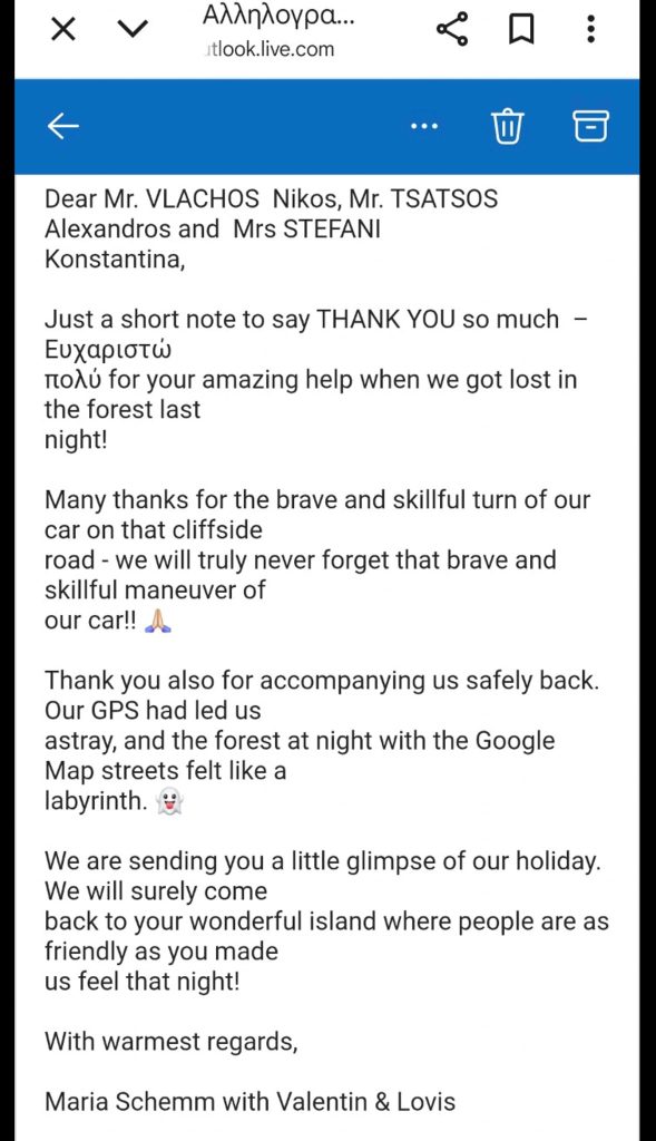Όπως αναφέρει σε mail της προς την τοπική Αστυνομία της Λευκάδας η Μαρία Σκεμ, το περιστατικό σημειώθηκε το βράδυ της 19ης Σεπτεμβρίου, όταν υπό την καθοδήγηση της εφαρμογής της Google βρέθηκαν σε δασική περιοχή, όπου οι δρόμοι -όπως αναφέρει- έμοιαζαν με… λαβύρινθο και οδηγήθηκαν σε ένα αδιέξοδο. Ευχαριστεί δε ονομαστικά τους τρεις αστυνομικούς, που τους εντόπισαν και τους έσωσαν κυριολεκτικά, αναγκάζοντας τους να κάνουν αναστροφή.