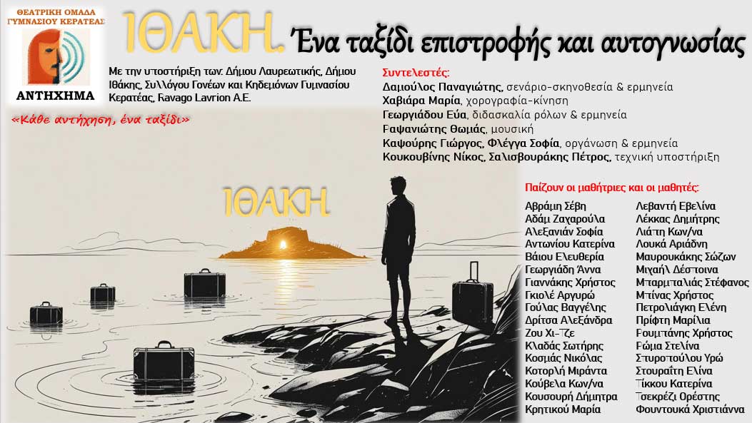 Το θεατρικό έργο «Ιθάκη: Ένα ταξίδι επιστροφής και αυτογνωσίας» από τη θεατρική ομάδα του Γυμνασίου Κερατέας «Αντήχημα», βασίζεται σε πρωτότυπο σενάριο που προσεγγίζει το ομηρικό έπος της «Οδύσσειας» με μια σύγχρονη ματιά. Το σενάριο και τη σκηνοθεσία έχει επιμεληθεί ο φιλόλογος Παναγιώτης Δαμούλος, τις χορογραφίες η καθηγήτρια Φυσικής Αγωγής Μαρία Χαβιάρα, ενώ τη διδασκαλία των ρόλων ανέλαβε η καθηγήτρια Εύα Γεωργιάδου. Η πολυμελής ομάδα καθηγητών και μαθητών συνεργάστηκε με μεράκι, μετατρέποντας τη μυθική διαδρομή του Οδυσσέα σε μια αναζήτηση που αφορά τον άνθρωπο κάθε εποχής.