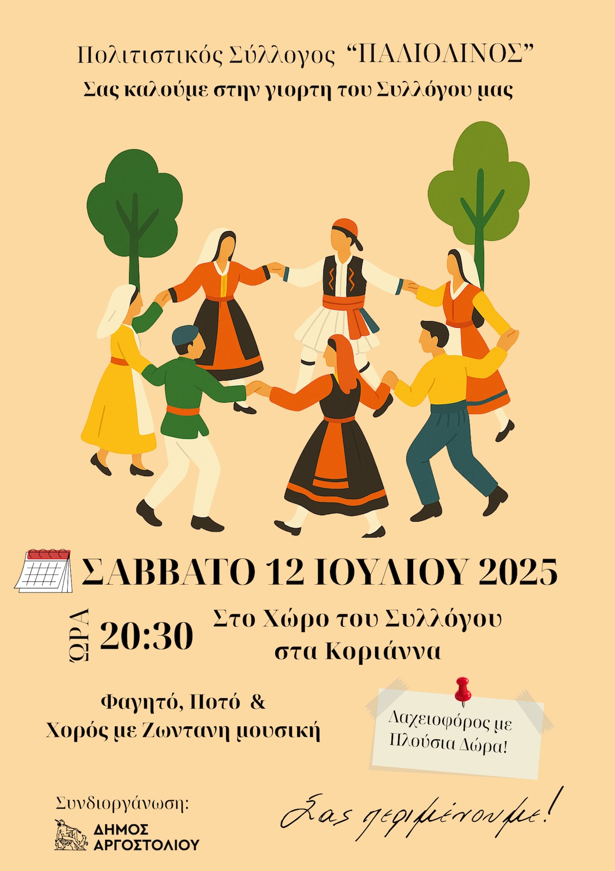 Η καλοκαιρινή εκδήλωση του συλλόγου, ζωντανή μουσική με τους MONTENERO, φαγητό και ποτό & πλούσια Λαχειοφόρο αγορά. Διοργάνωση Π.Σ. «Παλιολινός» & Δήμος Αργοστολίου.