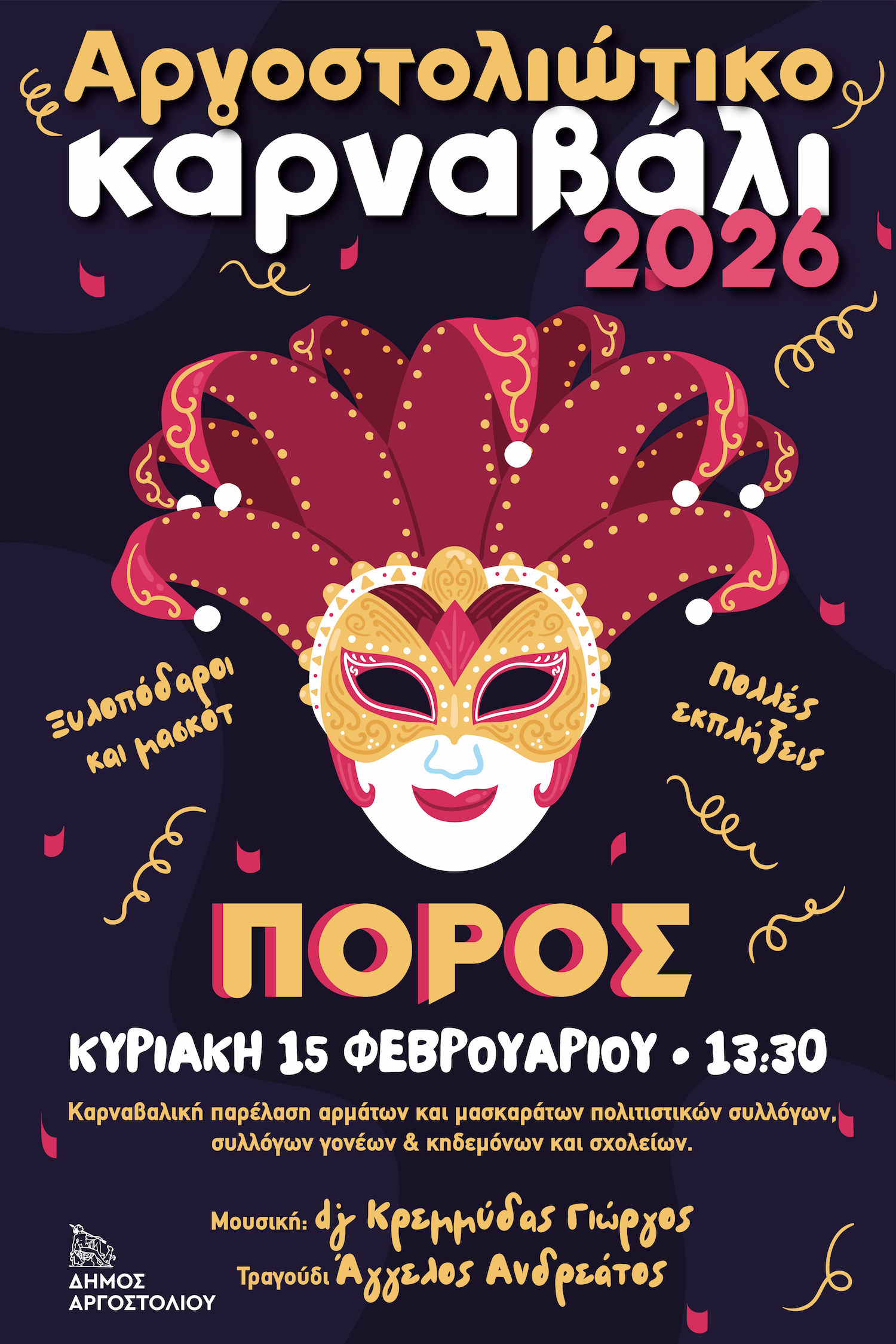 Την Κυριακή 15 Φεβρουαρίου, στις 13:30, ο Πόρος ντύνεται αποκριάτικα και υποδέχεται την κεφάτη Καρναβαλική Παρέλαση, γεμάτη μουσική, χρώμα και χορό!