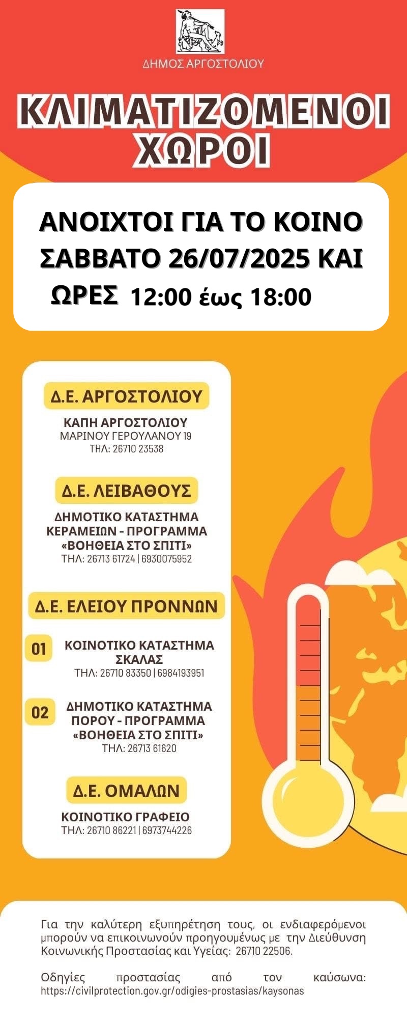 Λόγω των υψηλών θερμοκρασιών που θα επικρατήσουν το Σάββατο 26/07, ο Δήμος Αργοστολίου, ενημερώνει ότι στην επικράτεια του, για το ανωτέρω διάστημα θα λειτουργούν κλιματιζόμενοι χώροι, από τις 12:00 έως τις 18:00 για την προστασία ευάλωτων ομάδων, ως κατωτέρω: