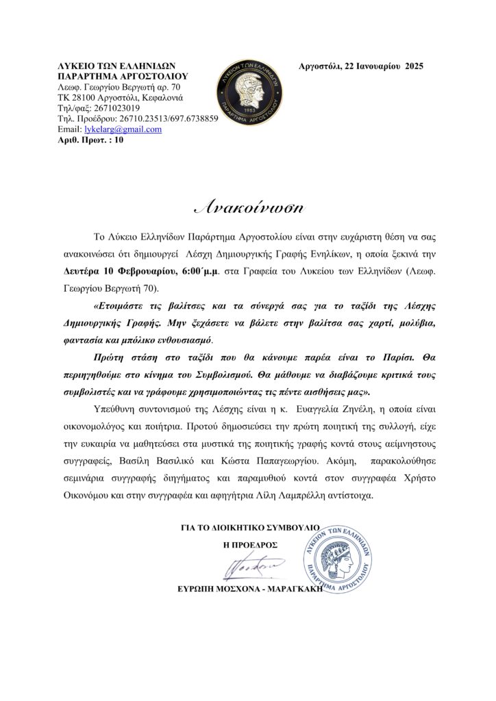 Από το Λύκειο Ελληνίδων Αργοστολίου – Ξεκινά τη Δευτέρα 10-2-25 και ώρα 6:00 μ.μ. στα Γραφεία του Λυκείου Ελληνίδων