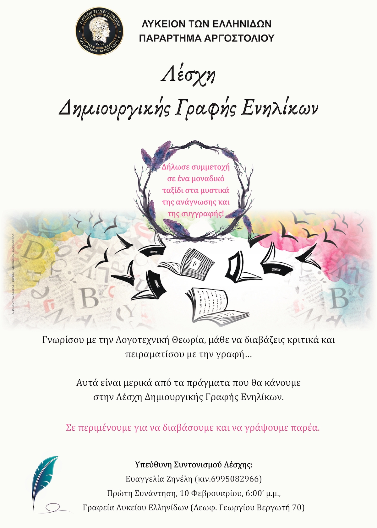 Το Λύκειο Ελληνίδων Παράρτημα Αργοστολίου είναι στην ευχάριστη θέση να σας ανακοινώσει ότι δημιουργεί Λέσχη Δημιουργικής Γραφής Ενηλίκων, η οποία ξεκινά την Δευτέρα 10 Φεβρουαρίου, 6:00΄μ.μ. στα Γραφεία του Λυκείου των Ελληνίδων (Λεωφ. Γεωργίου Βεργωτή 70).