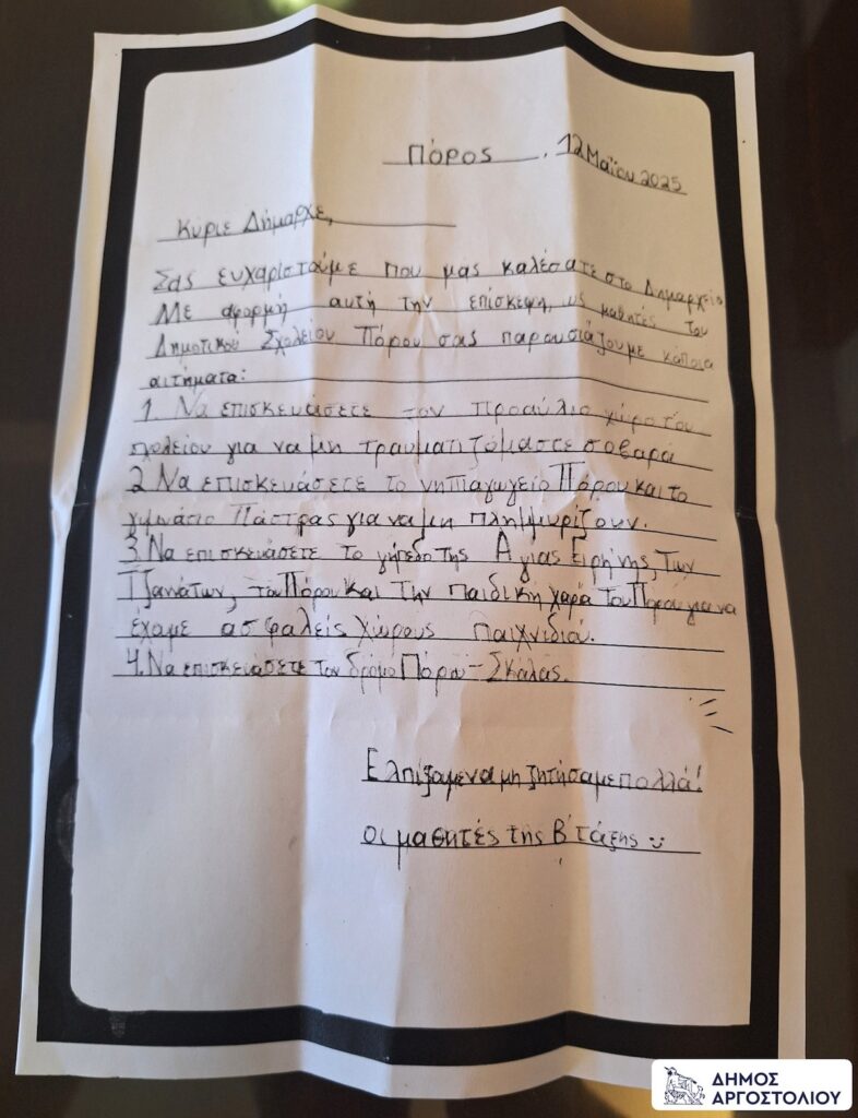 Τις μαθήτριες και τους μαθητές της Β τάξης του Δημοτικού Σχολείου Πόρου, μαζί με τις δασκάλες τους, κυρία Αγορή Παπιώτου και κυρία Φωτεινή Γιαννάκη, είχε την τιμή και τη χαρά να υποδεχθεί στο γραφείο του την Τρίτη 13 Μαΐου 2025, ο Δήμαρχος Αργοστολίου κ. Θεόφιλος Μιχαλάτος.