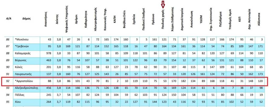 Σύμφωνα με την Έκθεση Αξιολόγησης Δημοσίων Υπηρεσιών του Υπουργείου Εσωτερικών (Μάιος 2025, σελίδα 107, αριθμός 92), ο Δήμος Αργοστολίου κατατάσσεται στην 53η θέση μεταξύ 184 δήμων στην κατηγορία «Παιδικές Χαρές».