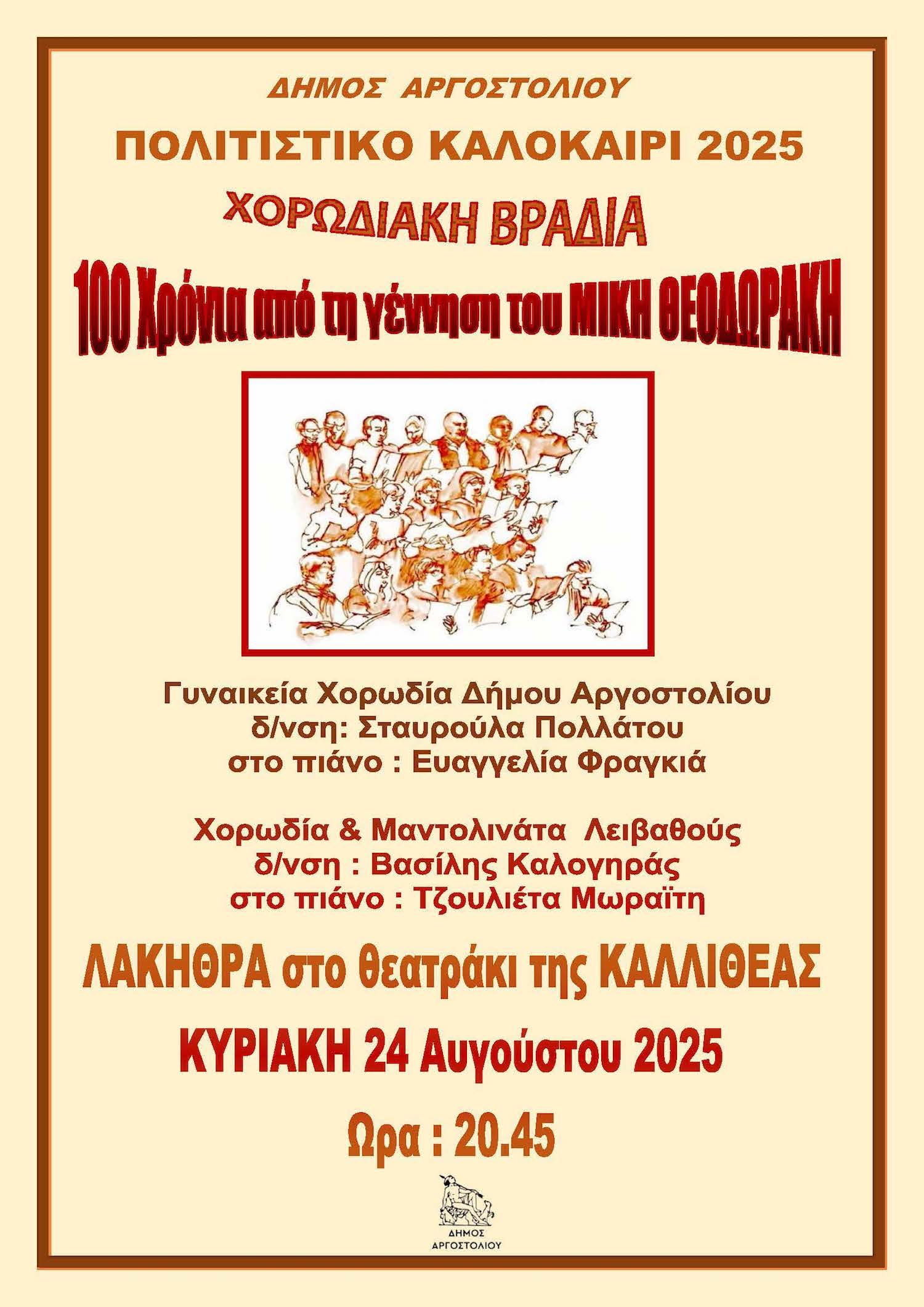 • ΛΕΙΒΑΘΩ, ΛΑΚΗΘΡΑ, στο θεατράκι της Καλλιθέας, ώρα 21:00. Χορωδιακή βραδιά με την καλοκαιρινή συναυλία της Χορωδίας Λειβαθούς,υπό τη δ/νση του Βασίλη Καλογηρά και τη συμμετοχή της Γυναικείας Χορωδίας του Δήμου Αργοστολίου, υπό τη δ/νση της Σταυρούλας Πολλάτου, σε όμορφες και εναρμόνιες μελωδίες της επτανησιακής, νεότερης και σύγχρονης Ελληνικής μουσικής. Η βραδιά θα είναι αφιερωμένη στα εκατό χρόνια από τη γέννηση του μεγάλου Έλληνα μουσικοσυνθέτη Μίκη Θεοδωράκη με ενδιαφέρουσες καλλιτεχνικές εκπλήξεις. Διοργάνωση : Δήμος Αργοστολίου, Κοινότητα Λακήθρας.