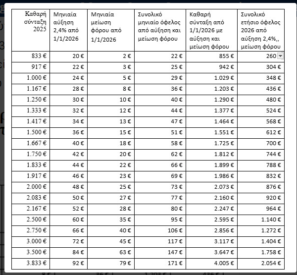 Σύμφωνα με τον σχετικό πίνακα που επεξεργάστηκε και δημοσιεύει το Capital.gr λόγω της αύξησης κατά 2,4%, και της μείωσης της παρακράτησης φόρου στις συντάξεις για το 2026: