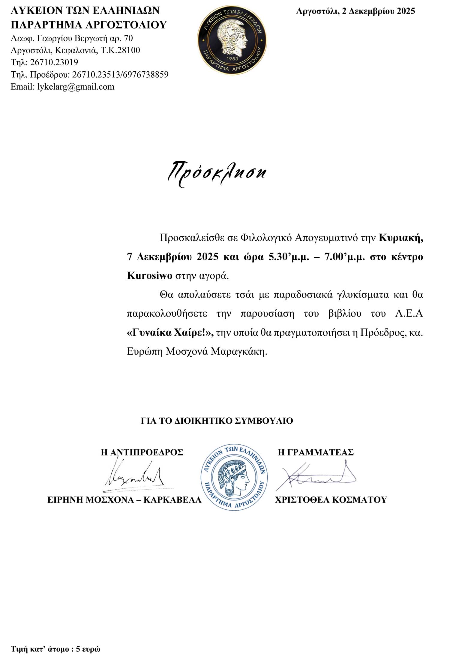 Προσκαλείσθε σε Φιλολογικό Απογευματινό την Κυριακή, 7 Δεκεμβρίου 2025 και ώρα 5.30’μ.μ. – 7.00’μ.μ. στο κέντρο Kurosiwo στην αγορά.Θα απολαύσετε τσάι με παραδοσιακά γλυκίσματα και θα παρακολουθήσετε την παρουσίαση του βιβλίου του Λ.Ε.Α «Γυναίκα Χαίρε!», την οποία θα πραγματοποιήσει η Πρόεδρος, κα. Ευρώπη Μοσχονά Μαραγκάκη.