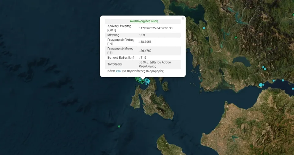 Η σεισμική δόνηση των 3,9 Ρίχτερ εντοπίστηκε 6 Χλμ. ΔΒΔ της Άσσου Κεφαληνίας ενώ το εστιακό της βάθος ήταν στα 11,5 χλμ.