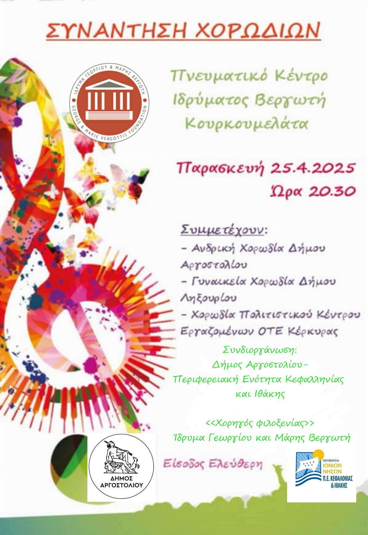 Συμμετέχουν: Ανδρική Χορωδία Δήμου Αργοστολίου – Γυναικεία Χορωδία Δήμου Ληξουρίου – Χορωδία Πολιτιστικού Κέντρου Εργαζομένων ΟΤΕ Κέρκυρας