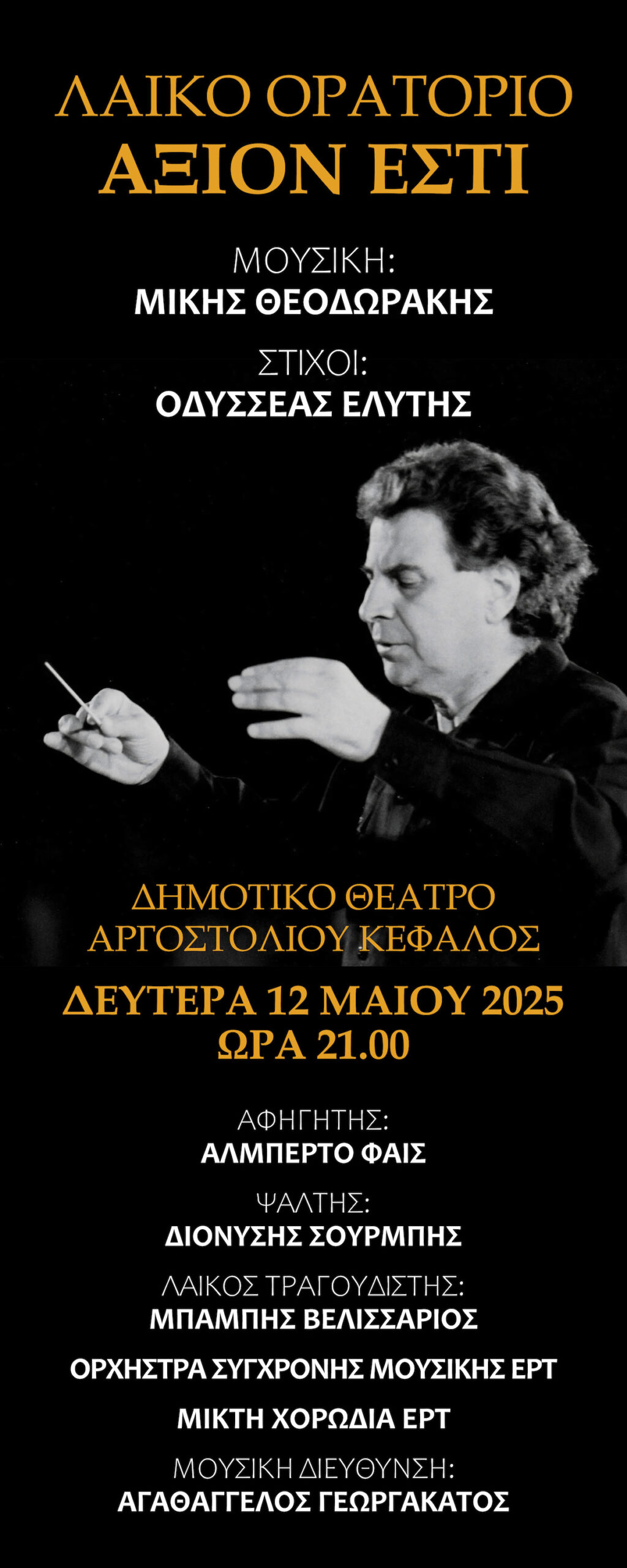 Συντελεστές της Μικτή Χορωδία ΕΡΤ, Ορχήστρα σύγχρονης μουσικής ΕΡΤ, Διονύσης Σούρμπης βαρύτονος, Αλμπέρτο Φάις αφηγητής, Μπάμπης Βελλισάριος λαϊκός τραγουδιστής, σε μουσική διεύθυνση του Διευθυντή της Χορωδίας Εθνικής Λυρικής Σκηνής Αγαθάγγελου Γεωργακάτου.
