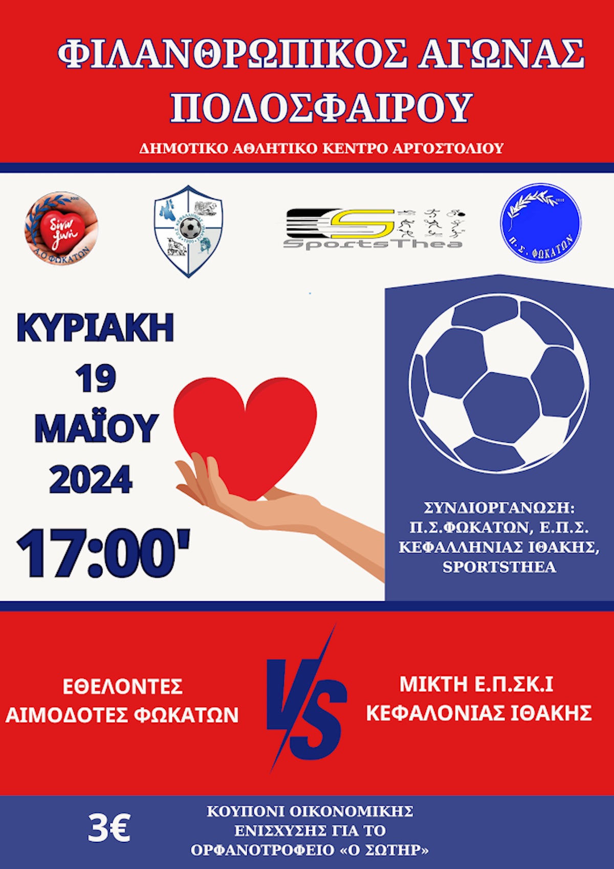 Η Ε.Π.Σ. ΚΕΦΑΛΛΗΝΙΑΣ – ΙΘΑΚΗΣ, ο Π.Σ. Φωκάτων και το αθλητικό site του Νομού μας Sportsthea, συνδιοργανώνουν τον καθιερωμένο φιλανθρωπικό αγώνα ποδοσφαίρου, ο οποίος φέτος θα διεξαχθεί την 19η Μαΐου 2024, ημέρα Κυριακή και ώρα 17.00 στο Δ.Α.Κ. Αργοστολίου, μεταξύ των ΕΘΕΛΟΝΤΩΝ ΑΙΜΟΔΟΤΩΝ ΦΩΚΑΤΩΝ και της ΜΙΚΤΗΣ ΚΕΦΑΛΟΝΙΑΣ ΚΑΙ ΙΘΑΚΗΣ.