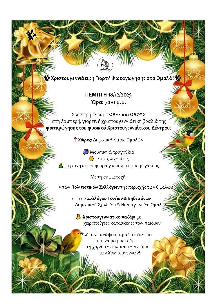 Σας περιμένουμε ΟΛΕΣ και ΟΛΟΥΣ στη λαμπερή, γιορτινή χριστουγεννιάτικη βραδιά της φωταγώγησης του φυσικού Χριστουγεννιάτικου Δέντρου, στο χώρο του Δημοτικού Κτιρίου ΟΜΑΛΩΝ με μουσική, τραγούδια, γλυκές λιχουδιές και συμμετοχή των Πολιτιστικών Συλλόγων και του Συλλόγου Γονέων & Κηδεμόνων Δημοτικού Σχολείου & Νηπιαγωγείου Ομαλών, με παζάρι χειροποίητων κατασκευών των παιδιών.